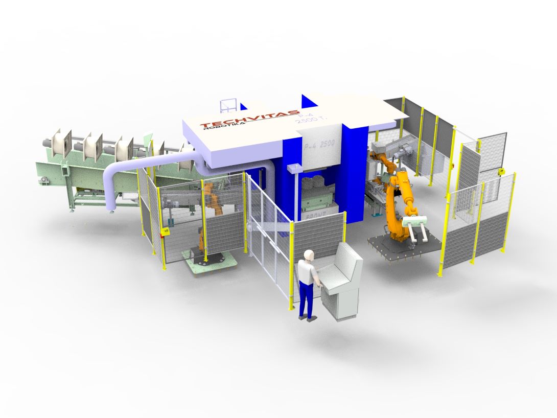 Užduotis.  Projekto tikslas buvo ne tik padidinti gamybos našumą, bet ir pagerinti gaminių kokybę, leidžiant vienam operatoriui valdyti visą liniją. Projektas apėmė esamų įrangos komponentų modernizavimą (Presas, tepimo, aušinimo ir kitos sistemos) ir naujų technologijų, įskaitant robotus, integraciją. Svarbu buvo užtikrinti, kad naujoji sistema būtų lanksti ir leistų ateityje lengvai įdiegti papildomas robotizavimo funkcijas, pavyzdžiui, apkirtimo preso automatizavimą.